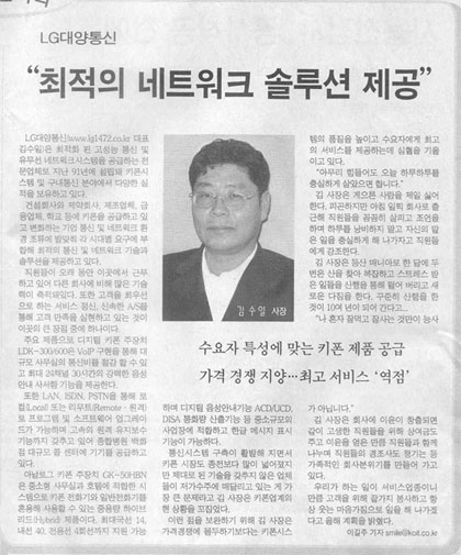 ¾È³çÇϼ¼¿ä! LG´ë¾çÅë½ÅÀÔ´Ï´Ù. 2006³â 1¿ù16ÀÏÀÚ Á¤º¸Åë½Å½Å¹®ÀÇ ¸®µùÄÄÆÛ´Ï ±â»ç¶õ¿¡ ÀúÈñ LG´ë¾çÅë½Å ±è¼öÀÏ»çÀå´Ô¿¡ ´ëÇÑ ÀÎÅͺ䰡 ¼Ò°³ µÇ¾ú½À´Ï´Ù. Ç×»ó ³ë·ÂÇÏ´Â LG´ë¾çÅë½ÅÀÌ µÇ°Ú½À´Ï´Ù.